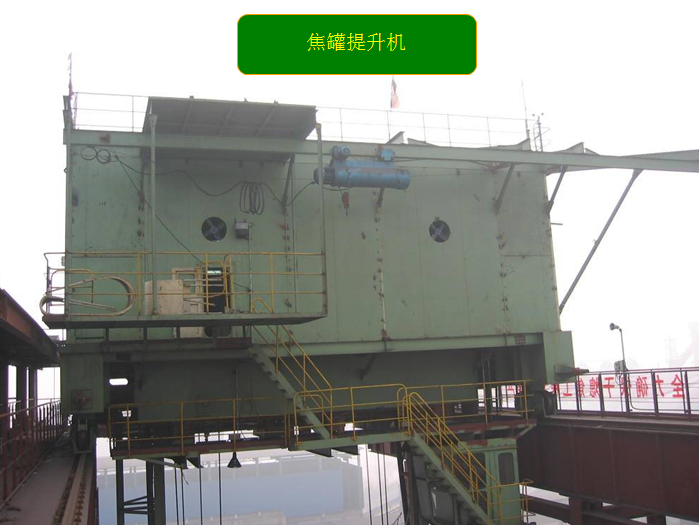 运行于提升井架和干熄炉顶轨道上,将装满红焦的焦罐提升并横移至干熄炉炉顶,与装入装置配合,将红焦装入干熄炉内。装焦完毕后又将空罐经提升、走行和下降落座在焦罐台车上。