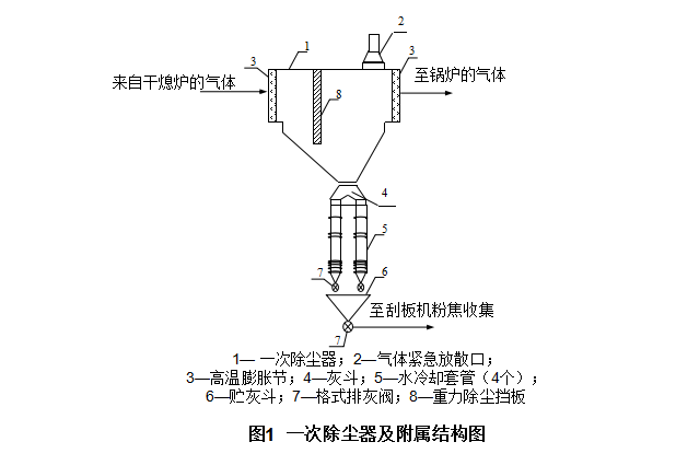 以备锅炉爆管时紧急放散蒸汽。一次除尘器底部设有灰斗,用来收集焦粉。灰斗与4根水冷套管相连,水冷套管与贮灰斗相连。水冷套管上部设有料位计,达料位后水冷套管下部的排灰格式阀将焦粉排出至贮灰斗,贮灰斗上部设有料位计,达到料位后贮灰斗下部的排灰格式阀向刮板机排出焦粉。