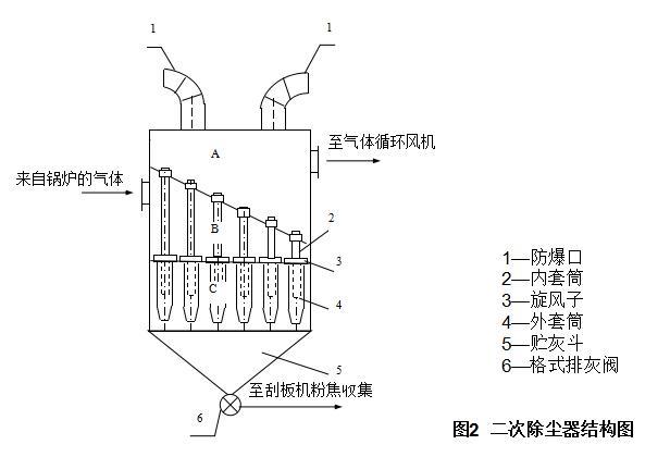 利用重力除尘原理将循环气体中的大颗粒焦粉进行分离,减少循环气体对锅炉炉管(主要是二次过热器管道)产生的冲刷磨损,达到保护锅炉炉管的目的。