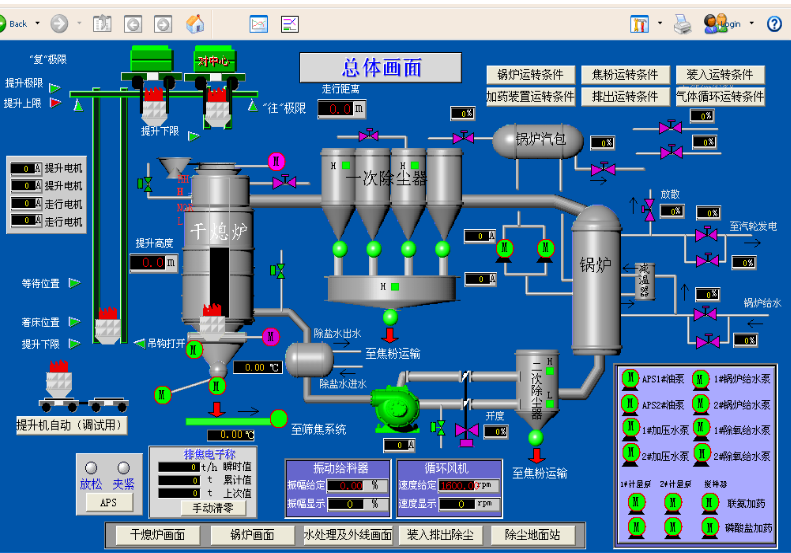 干熄焦锅炉干熄焦系统的重要组成部分。惰性循环气体在干熄炉中冷却红焦后,吸收了红焦热量的高温循环气体经一次除尘器除去粗颗粒焦粉后进入锅炉,锅炉吸热产生蒸汽,被冷却的惰性循环气体经二次除尘器除去细颗粒的焦粉,再由循环风机鼓入干熄炉继续循环冷却红焦。