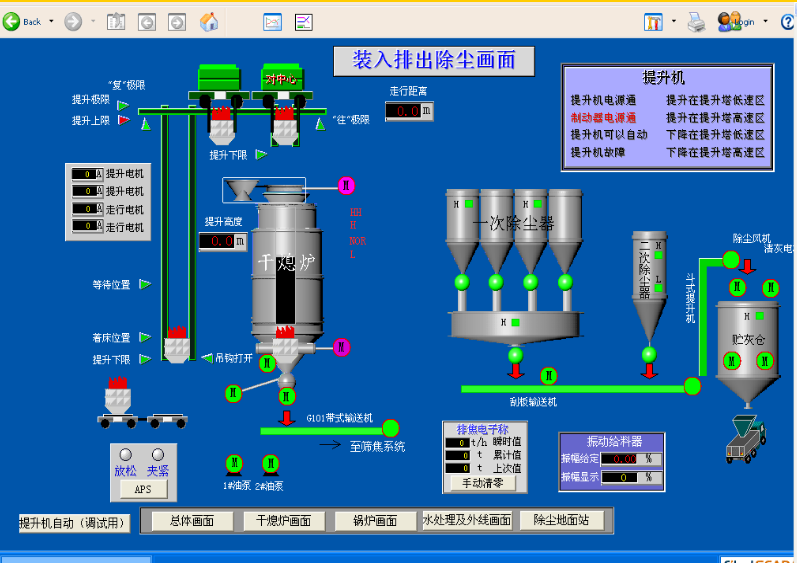 电机车牵引焦罐台车与拦焦车对位后,旋转焦罐开始旋转,旋转平稳后向推焦车发出推焦指令,接焦完毕后,旋转焦罐经减速位置停止在起初的停止位置上,停稳后,电机车牵引焦罐台车走行至干熄炉提升井架底部,经APS定位夹紧后,接空罐。随即满灌对位与提升,将装满红焦的焦罐提升至提升井架上限,到达上限后,提升机开始走行,达干熄炉上方时,装入装置也打开到位,提升机即开始卷下,焦罐落座后,提升机继续卷下,焦罐底门在重力作用下与吊杆继续下降,自动完成开门放焦动作。红焦落入装入装置料斗后,经分料板与料钟布料均匀地装入干熄炉。