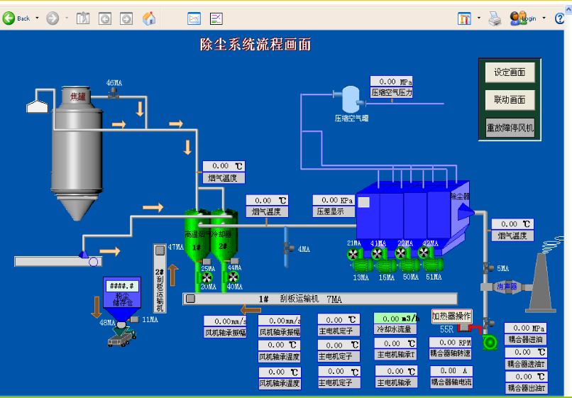 吹扫风机向电磁振动给料器、旋转密封阀不间断地吹入空气,以保证设备壳体内部正压,防止灰尘进入,延长设备使用寿命,同时降低电磁振动给料器线圈的温度,电磁振动给料器线圈的温度要求不高于设定值。当吹扫风机出现故障时,三通电磁切换阀自动切换到管道压缩空气或氮气给电磁振动给料器和旋转密封阀送风。